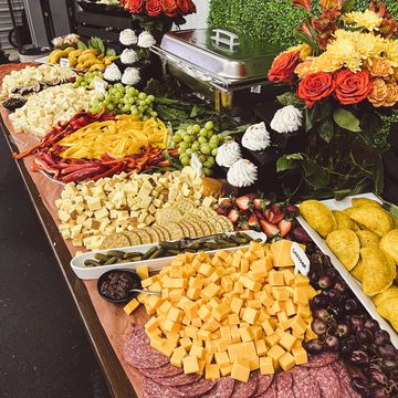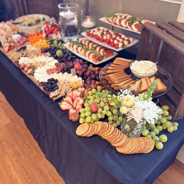 Various Cheeses & Charcuterie Meats, Fresh Fruit, Crackers, Accoutrements, & a Variety of Vegetables and Dips. All presented on elegantly elevated displays & accented with Greenery and Flowers.